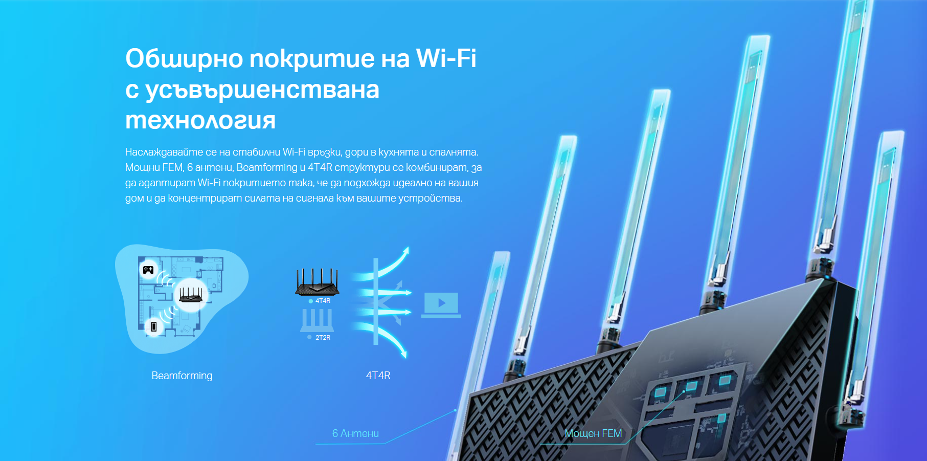 | WiFi Range | Къща с 3 спални 6 × фиксирани антени с висока производителност Множество антени образуват усилващ сигнал, за да покрият повече посоки и големи площи Формиране на лъчи Концентрира силата на безжичния сигнал към клиентите, за да разшири обхвата на WiFi Мощност с висока мощност Подобрява мощността на предаване, за да засили покритието на сигнала 4T4R Множество потоци в една и съща лента засилват толерантността към повреда в предаването |