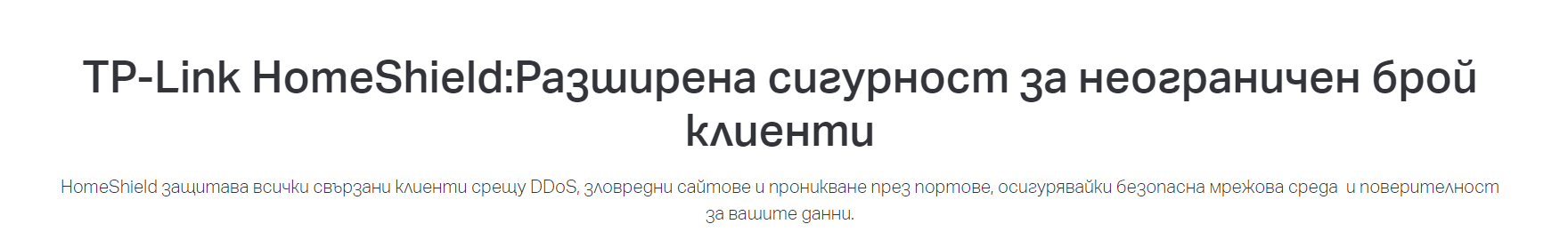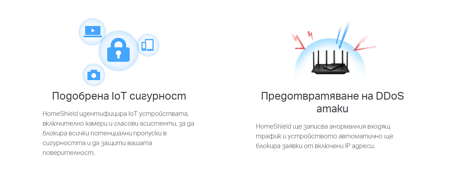 | Network Security | SPI защитна стена Контрол на достъпа IP и MAC обвързване Шлюз на слоя за приложения HomeShield сигурност IoT защита в реално време Блокиране на злонамерен сайт Система за предотвратяване на проникване Предотвратяване на DDoS атаки Скенер за домашна мрежа |