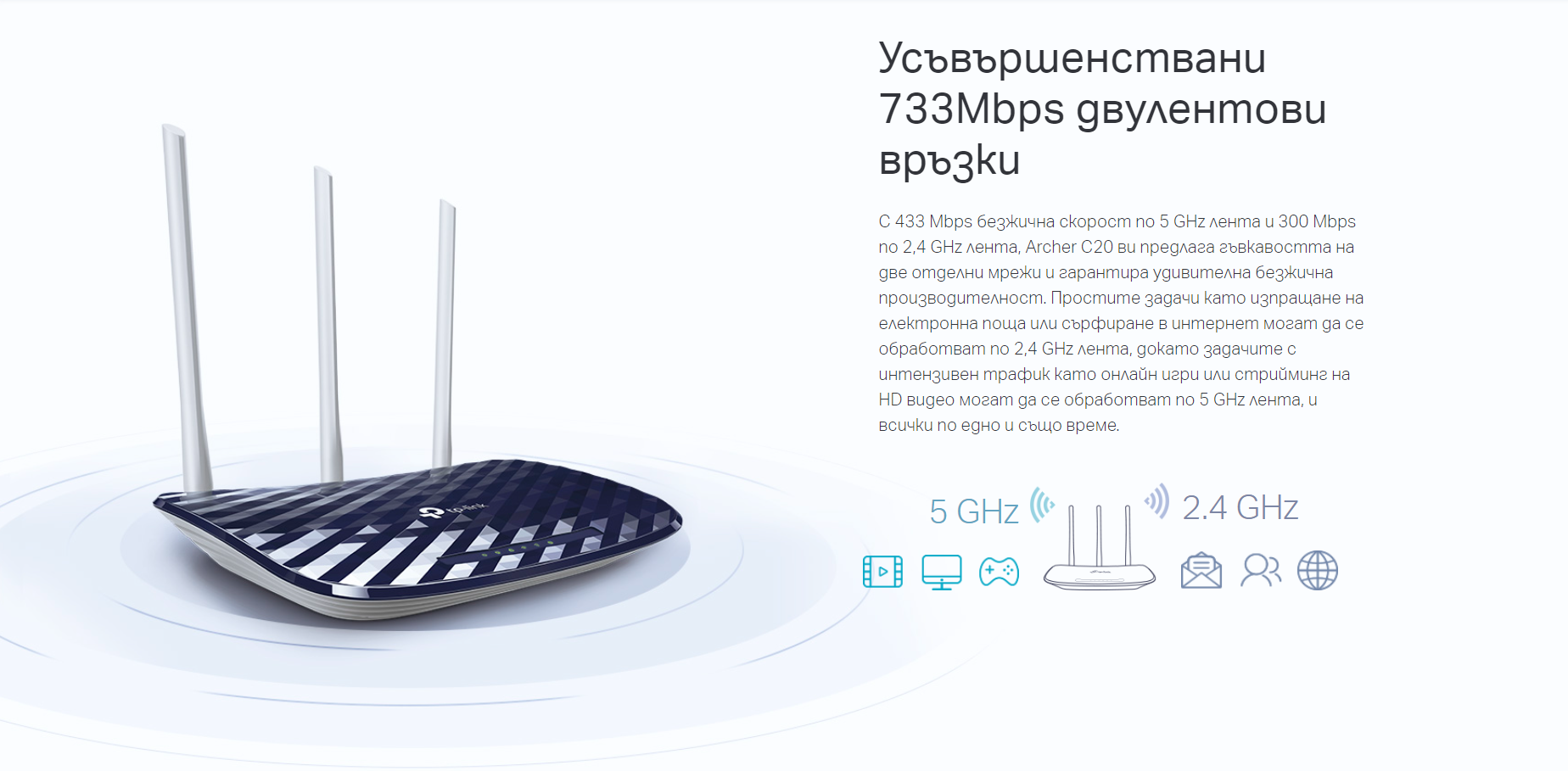 - Едновременни 2,4 GHz 300Mbps и 5 GHz 433Mbps връзки за 733Mbps обща достъпна пропускателна способност