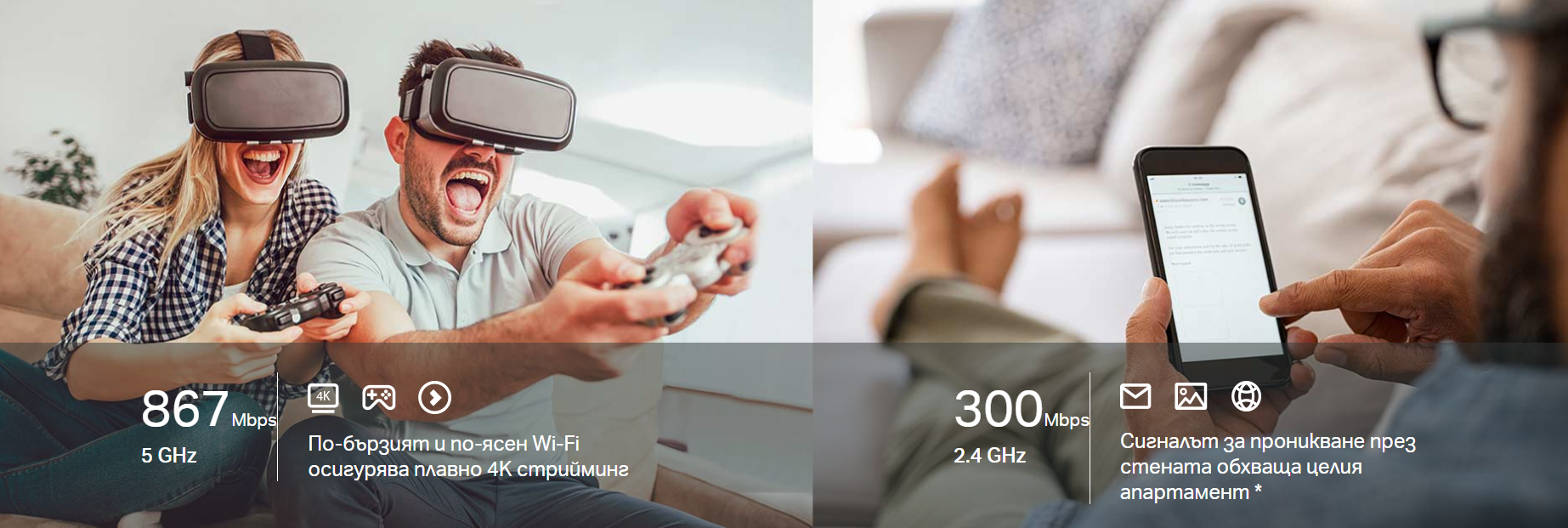 докато традиционната честотна лента от 2,4 GHz осигурява далечна и стабилна връзка с останалите ви устройства.