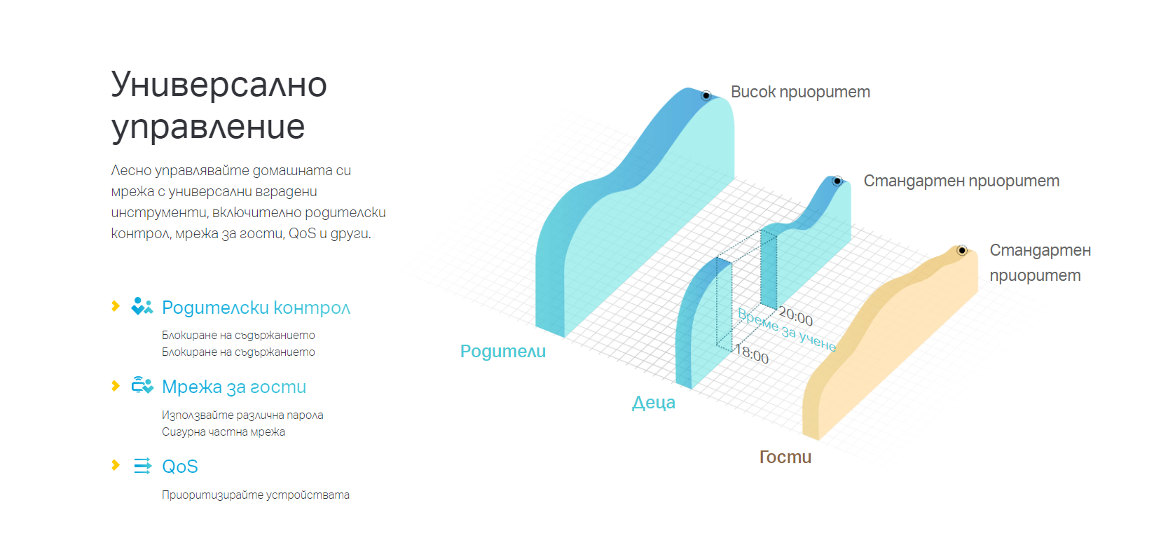 | Антена | 4× ненасочени антени | Quality of Service | QoS по устройства |
