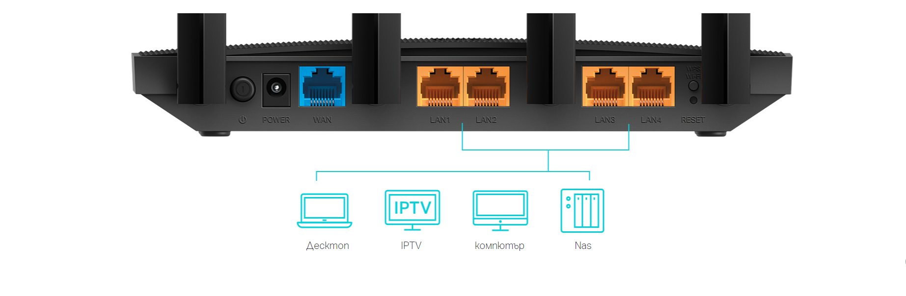 Gigabit Ethernet портовете (1 WAN + 4 LAN) осигуряват максимална кабелна скорост.