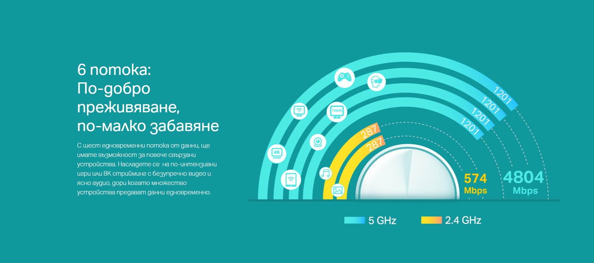| WiFi Speeds | AX5400 5 GHz: 4804 Mbps (802.11ax) 2.4 GHz: 574 Mbps (802.11ax) |
