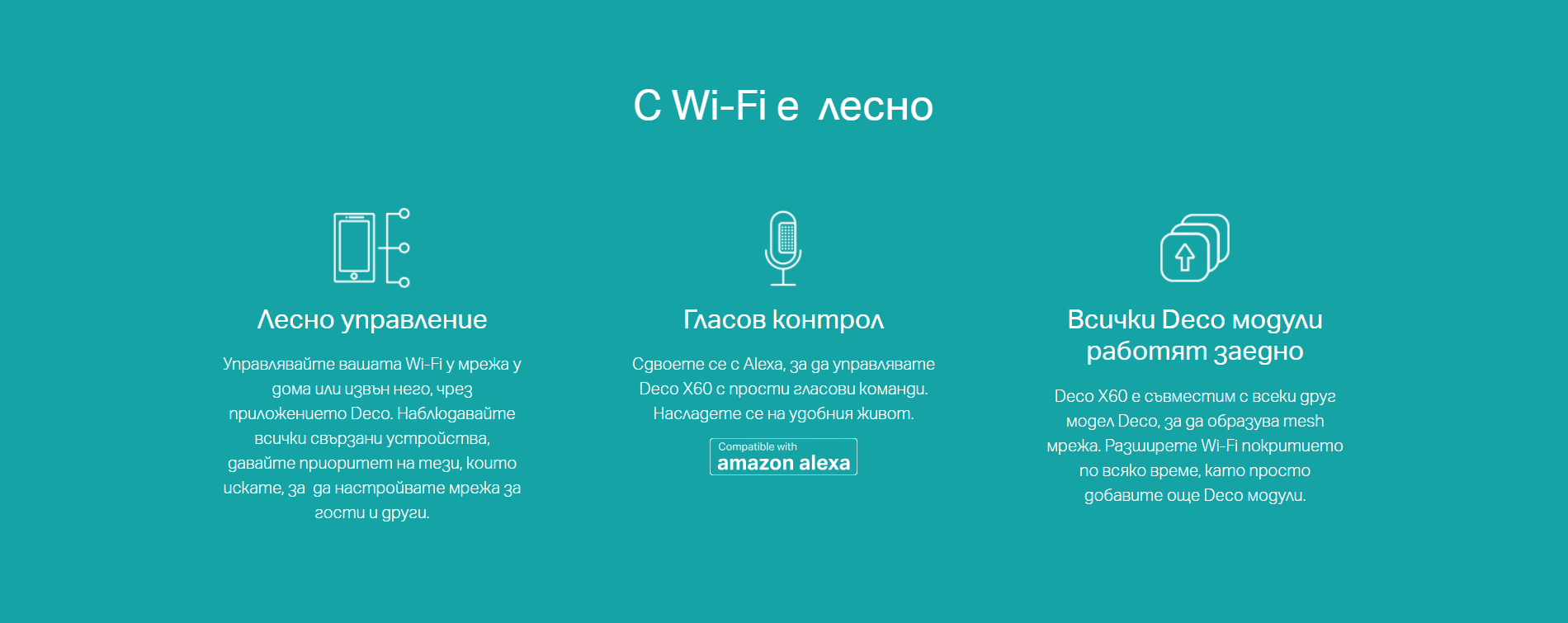 | Package Contents | Deco X60 (2-pack) 2 Deco X60 Units 1 RJ45 Ethernet Cable 2 Power Adapters Quick Installation Guide |