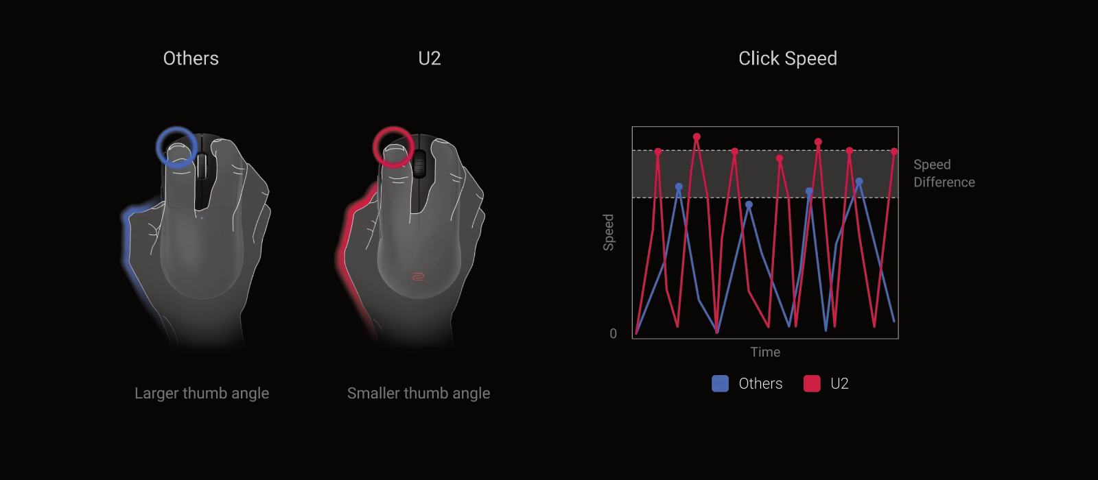 reduces the thumb angle, which supports a faster index finger click speed.