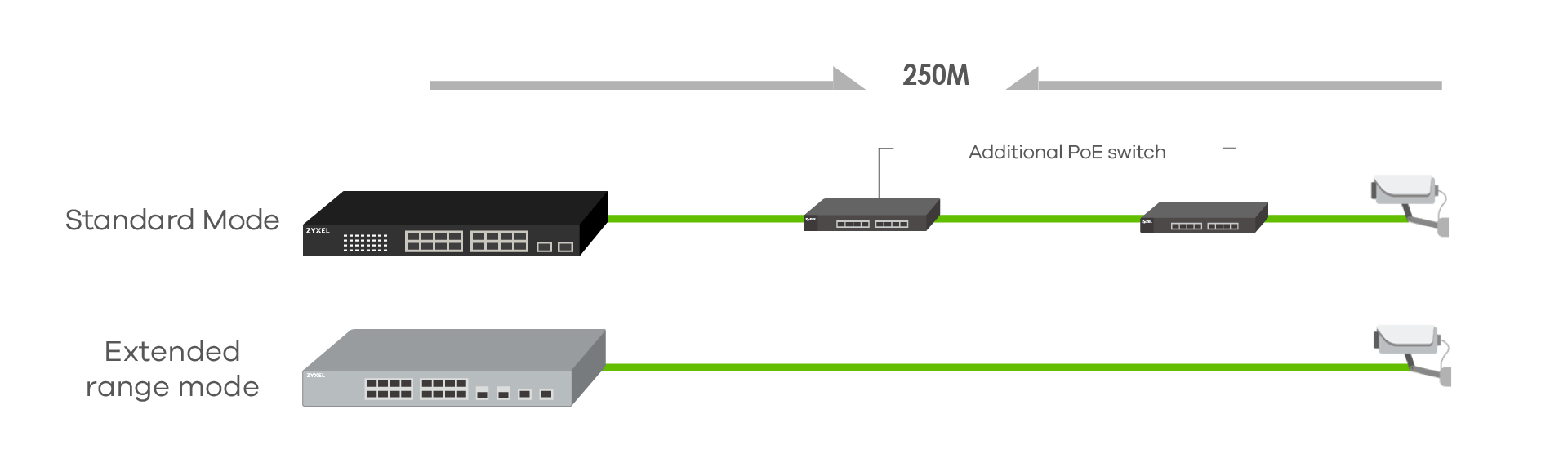 need to deploy IP camera or power devices using existing Cat 5e cable to distant locations. By enabling extended-range mode,