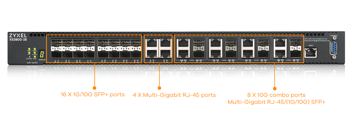 Multi-Gigabit combo (100M/1G/2.5G/5G/10G) RJ-45/(1G/10G) SFP+ |